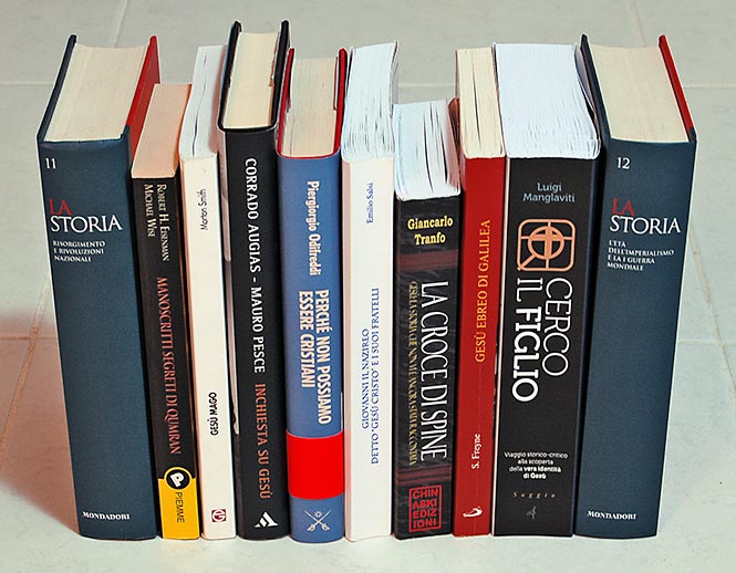 Nell’immagine, tenuti insieme da due tomi enciclopedici ai due estremi, da sinistra a destra sono presenti i seguenti volumi sul Gesù storico: due classici della ricerca “polemica”, «Manoscritti segreti di Qumran» di Robert H. Eisenman e «Gesù mago» di Morton Smith; poi due top-sellers italiani recenti, «Inchiesta su Gesù» di Augias/Pesce e «Perché non possiamo essere cristiani» di Odifreddi. Quindi altri due classici polemici, dello specifico filone del “Gesù Cristo=Giovanni di Gamala”, ossia «Giovanni il Nazireo» di E. Salsi e «La Croce di Spine» di G. Tranfo; infine un tipico esempio di ricerca mainstream, «Gesù ebreo di Galilea» di S. Freyne. A chiudere, «Cerco il Figlio».
